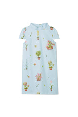 Our classic shift silhouette, upgraded for all your summer celebration needs. Cut in our warm weather cotton faille, with a roomy cap sleeve for just enough arm coverage. All of our favorite blooms are featured in this exclusive MM print, with a soft blue background to compliment your summer glow.